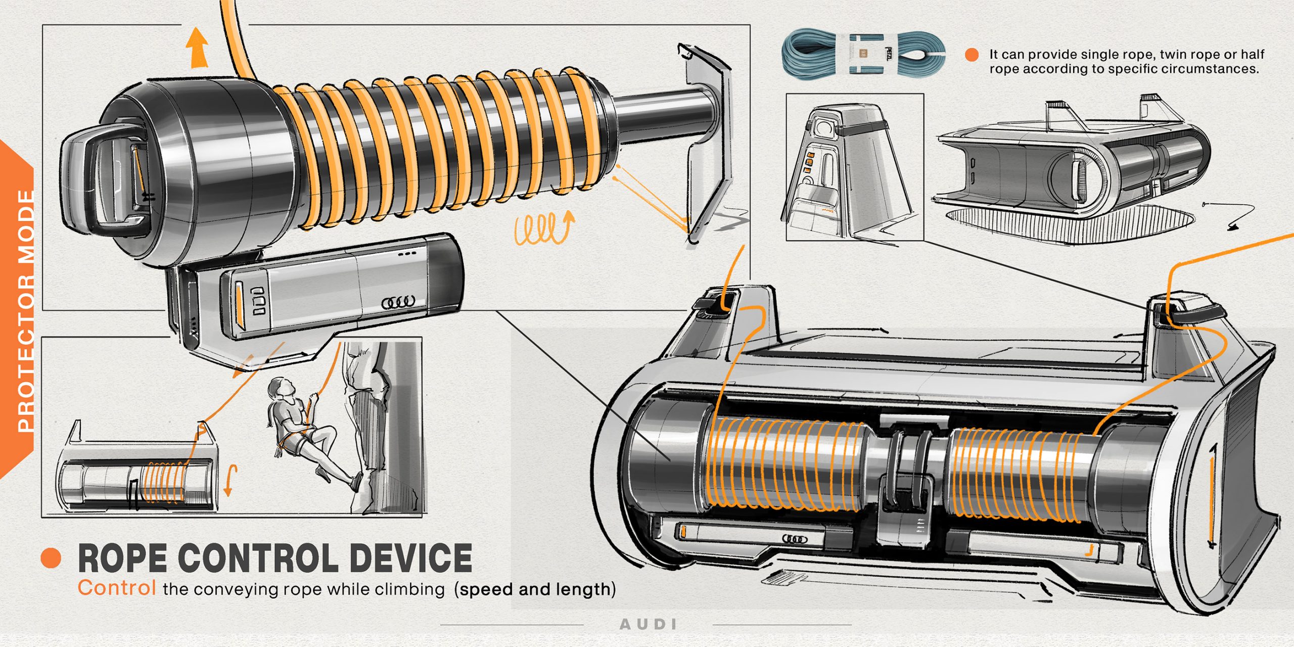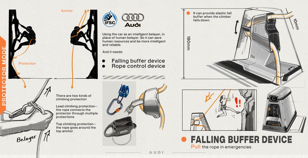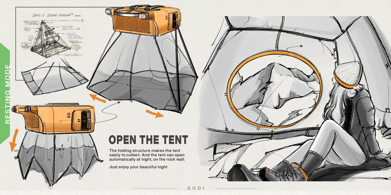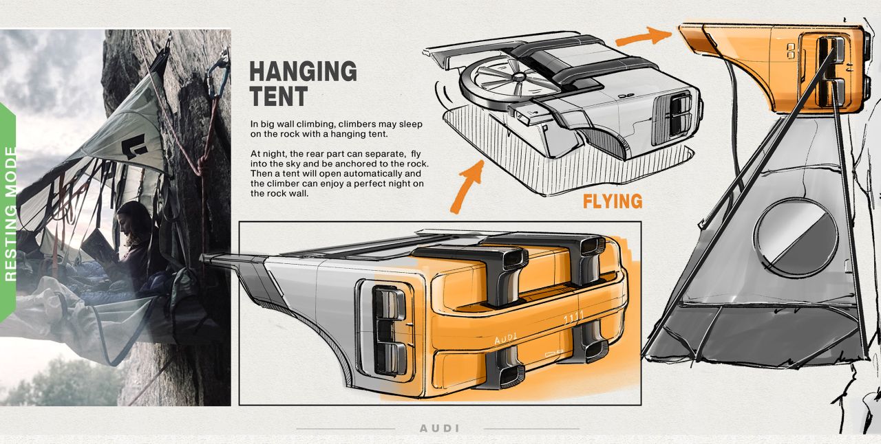 Audi AI-Climber with a flying rig for pitching tent on steep cliffs is bliss for rock climbers